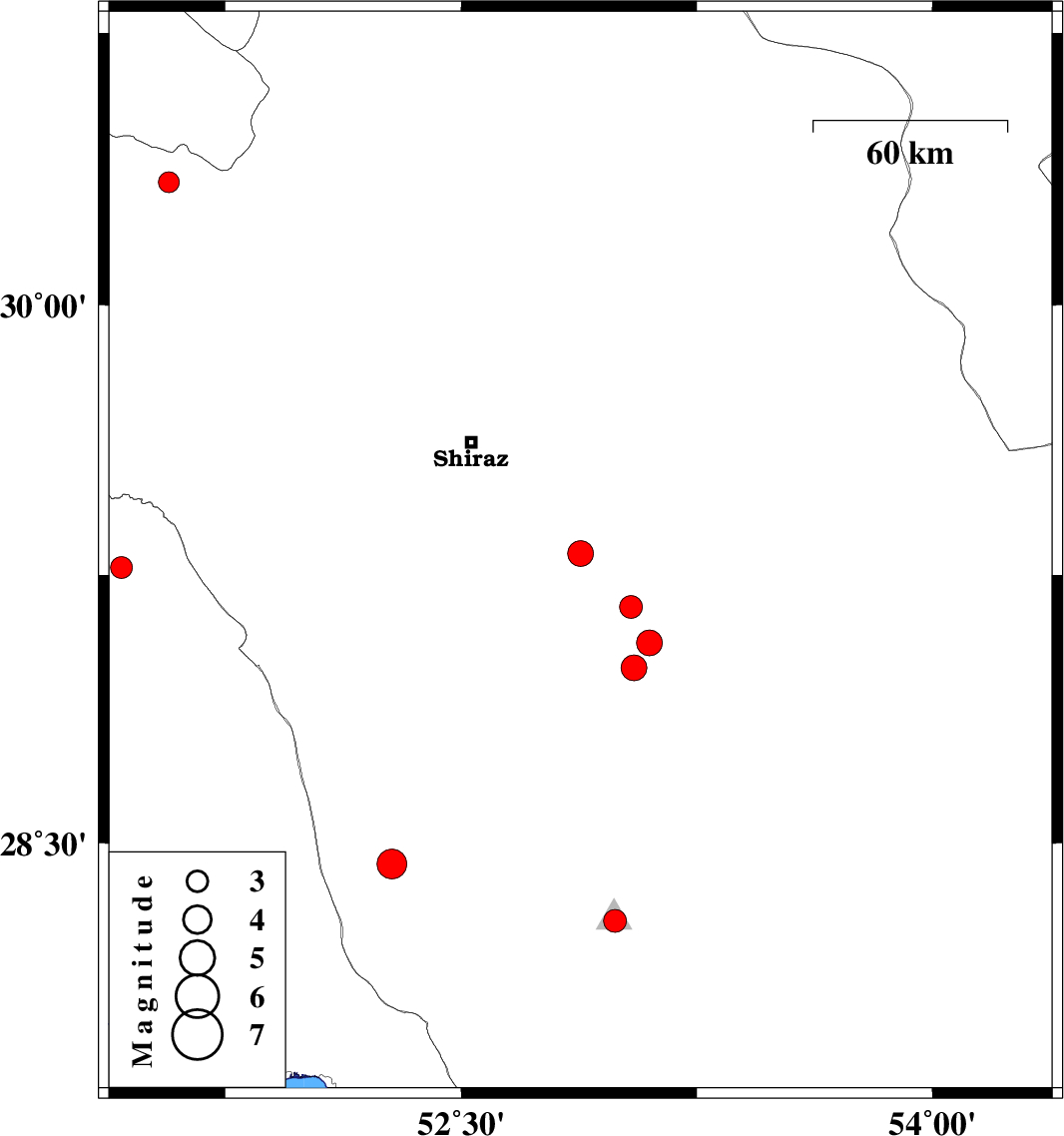 | 2012/06/11 | 09:35:04.2 | 14:05:04.2 | 29.27 | 51.42 | 15 | ML3.1 | Bushehr Province, 20 km East of Borazjan | ||