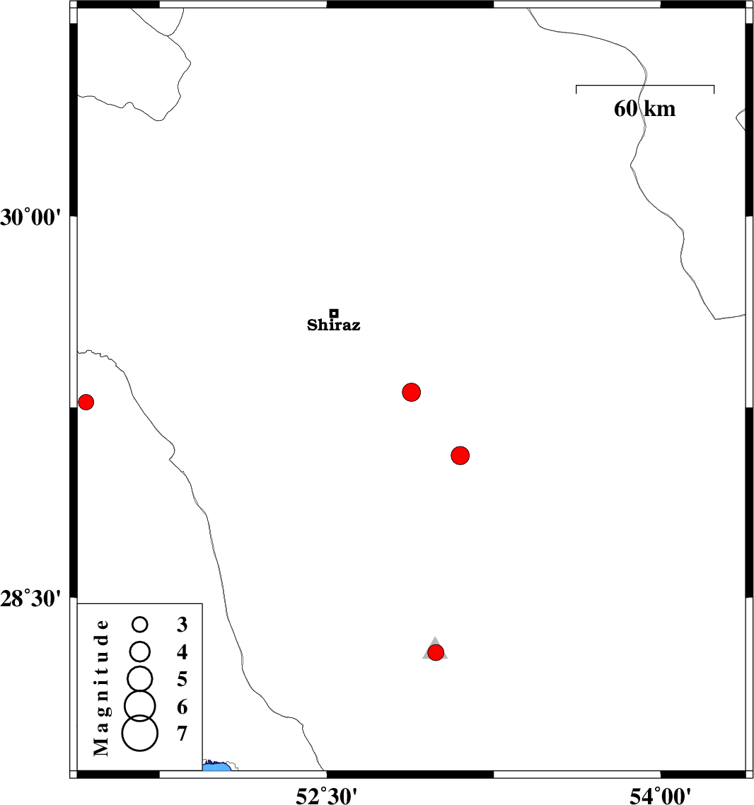 | 2012/06/11 | 09:35:04.2 | 14:05:04.2 | 29.27 | 51.42 | 15 | ML3.1 | Bushehr Province, 20 km East of Borazjan |