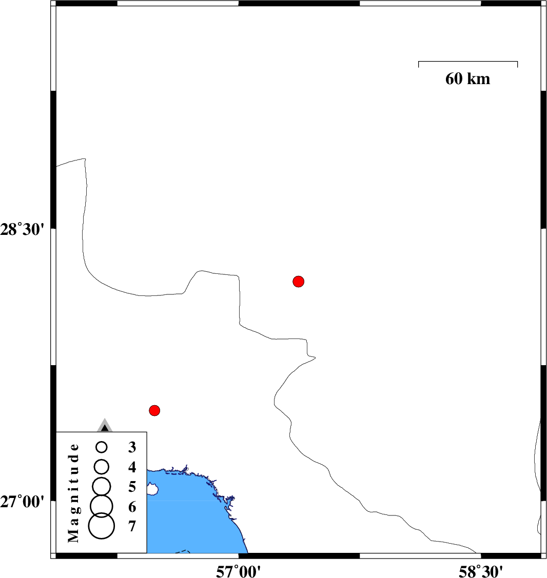 | 2012/06/16 | 08:57:23.9 | 13:27:23.9 | 27.5 | 56.48 | 14 | ML3 | Hormozgan Province, 40 km North-East of Bandar-e abbas |