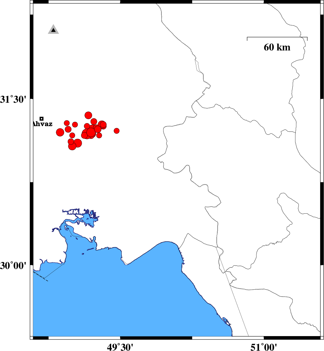 | 2012/06/06 | 19:55:18.8 | 00:25:18.8 | 29.73 | 50.7 | 44 | ML3.9 | Bushehr Province, 25 km North-East of Bandar-e genaveh | ||