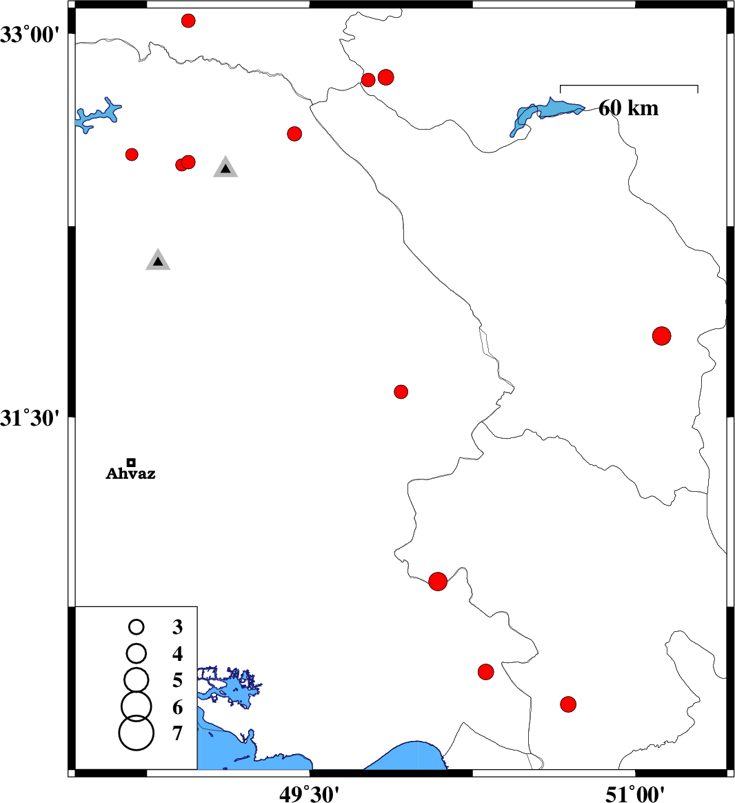 | 2012/06/02 | 02:54:44.3 | 07:24:44.3 | 32.5 | 48.94 | 15 | ML2.8 | Khoozestan Province, 20 km North-West of Lali | ||