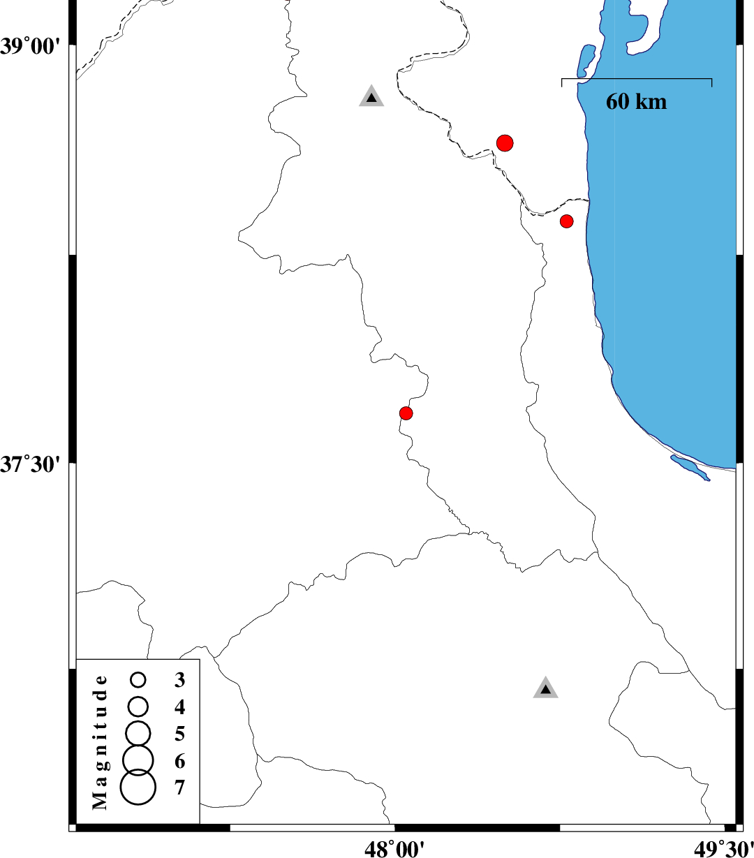 | 2012/06/10 | 22:30:20.8 | 03:00:20.8 | 38.65 | 48.5 | 14 | ML3.4 | Azerbaijan, 24 km North of Namin |