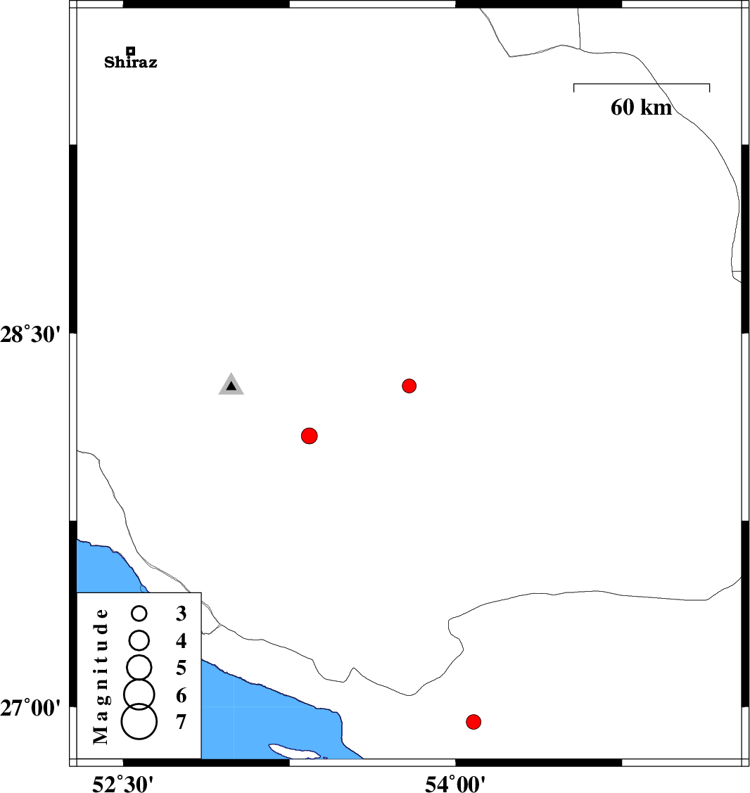 | 2012/06/23 | 09:03:25.9 | 13:33:25.9 | 28.09 | 53.34 | 6 | ML3.2 | Fars Province, 50 km South-West of Jahrom |