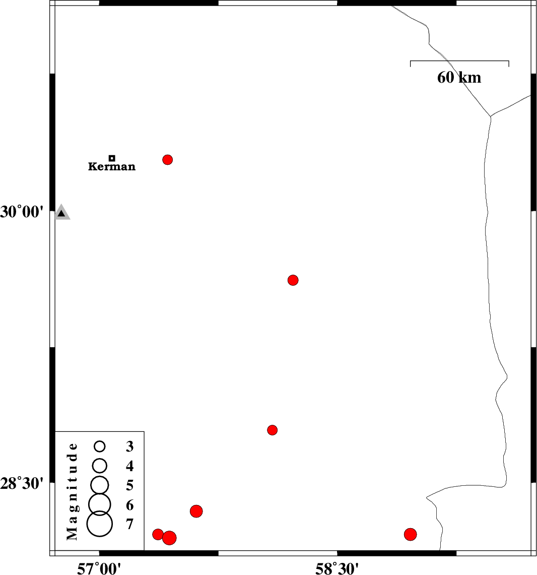 | 2012/06/28 | 11:27:37.5 | 15:57:37.5 | 28.21 | 58.96 | 15 | ML3.5 | Kerman Province, 116 km South-East of Bam | ||
