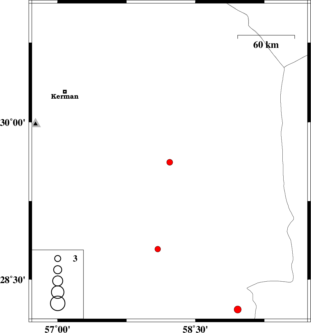 | 2012/06/30 | 14:35:59.2 | 19:05:59.2 | 29.62 | 58.22 | 14 | ML3 | Kerman Province, 59 km North-West of Bam | ||