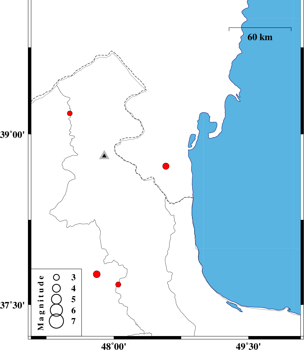 | 2012/06/25 | 03:22:29.2 | 07:52:29.2 | 39.18 | 47.51 | 14 | ML2.6 | Azarbaijan Sharghi Province, 53 km North-West of Germi |