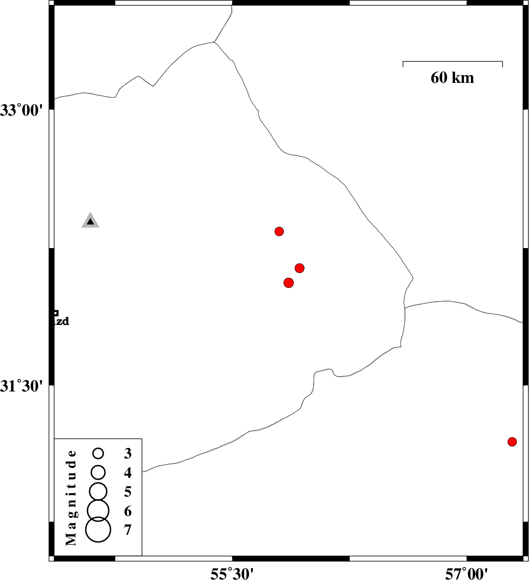 | 2012/06/04 | 17:55:14.4 | 22:25:14.4 | 32.14 | 55.93 | 15 | ML2.7 | Yazd Province, 78 km North-East of Bafq |