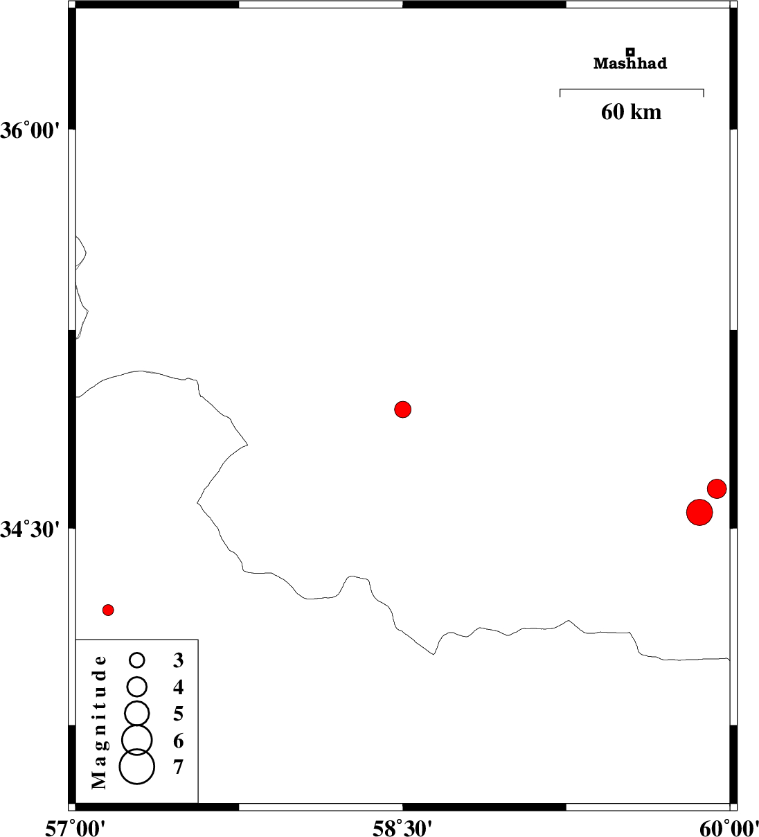 | 2012/07/04 | 00:06:05.4 | 04:36:05.4 | 34.95 | 58.5 | 17 | ML3.4 | Khorasan(center) Province, 32 km South of Kashmar | ||