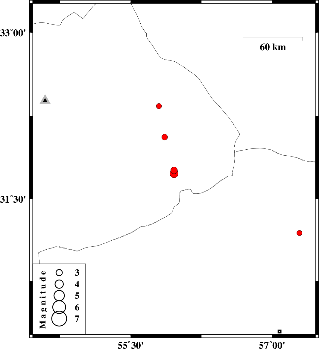 | 2012/07/04 | 19:10:15.0 | 23:40:15.0 | 31.73 | 55.96 | 15 | ML3.9 | Yazd Province, 55 km North-East of Bafq | ||