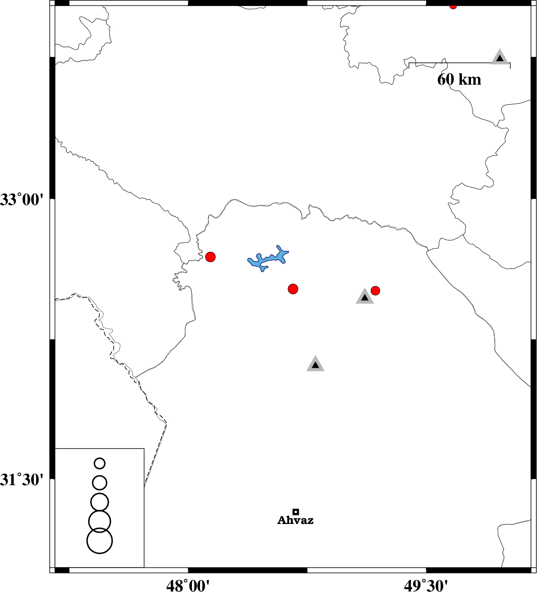 | 2012/07/07 | 18:47:22.9 | 23:17:22.9 | 32.52 | 48.66 | 16 | ML2.8 | Khoozestan Province, 30 km East of Andimeshk | ||