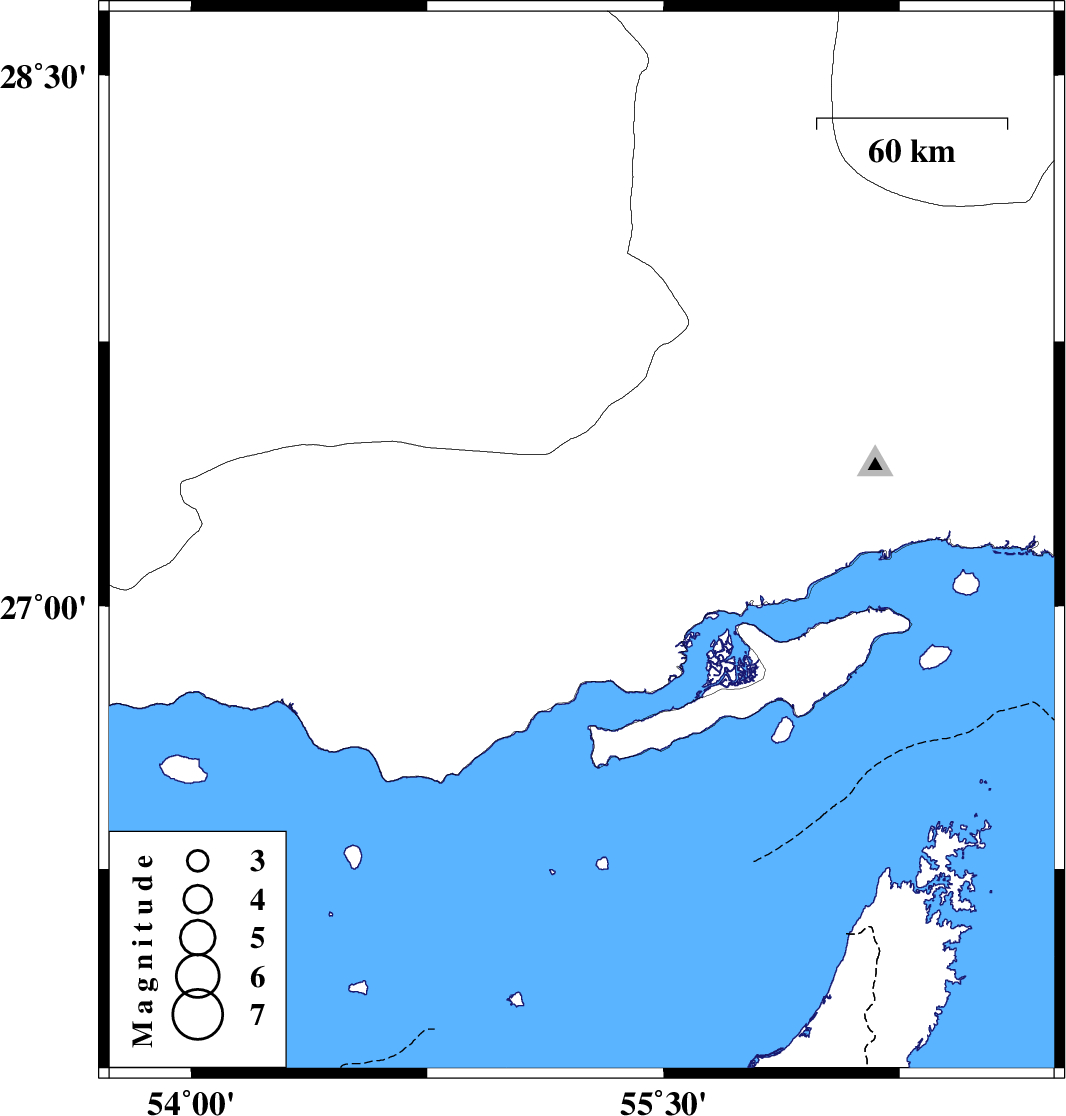 | 2012/07/12 | 21:18:30.0 | 01:48:30.0 | 27.18 | 55.24 | 39 | ML4 | Hormozgan Province, 87 km East of Bastak |