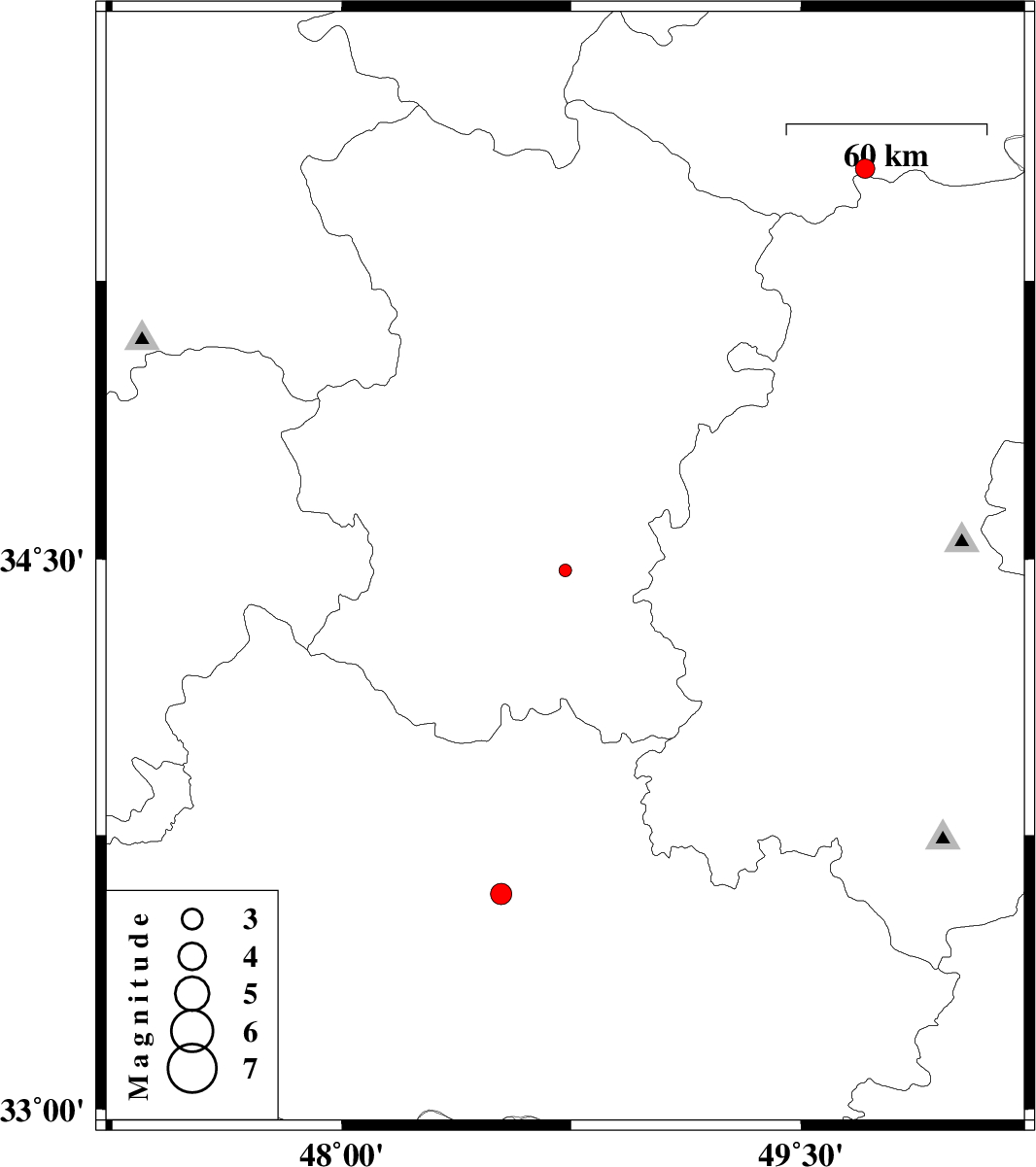 | 2012/07/11 | 22:55:27.2 | 03:25:27.2 | 33.59 | 48.52 | 16 | ML3.1 | Lorestan Province, 18 km North-East of Khorramabad | ||