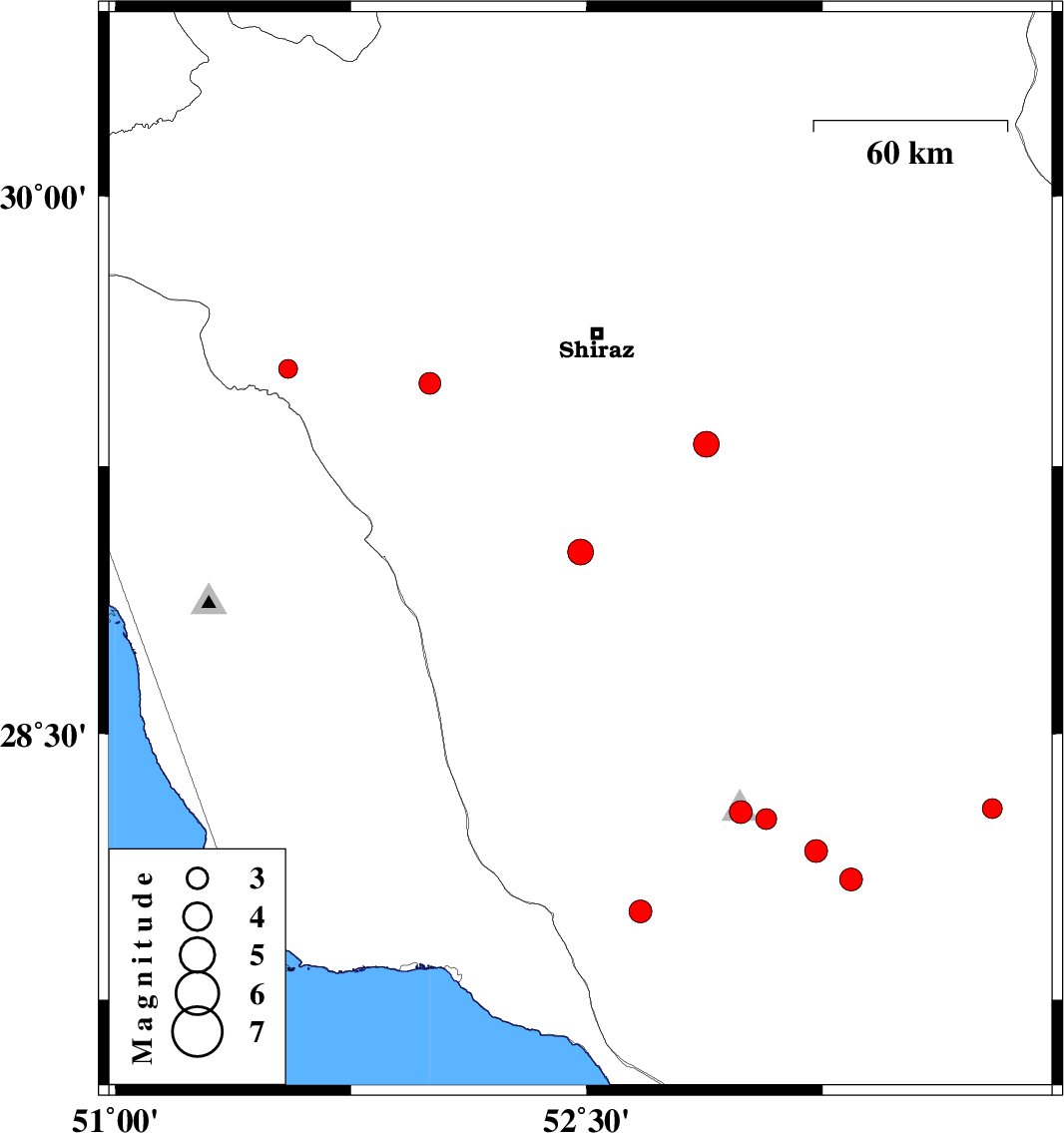 | 2012/07/06 | 00:20:35.4 | 04:50:35.4 | 29.52 | 51.55 | 6 | ML2.7 | Fars Province, 15 km West of Kazerun | ||