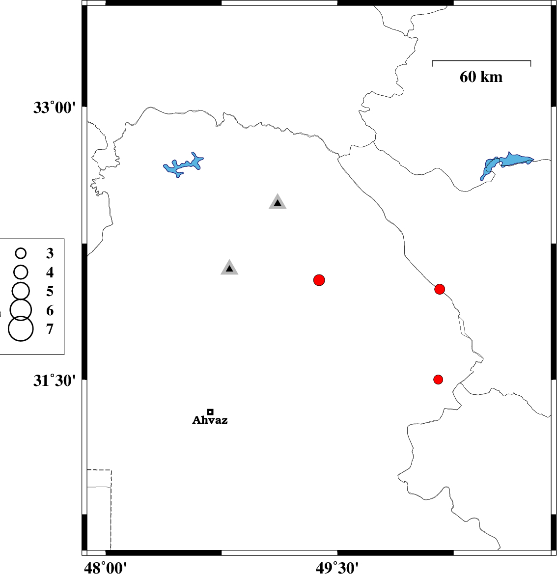 | 2012/07/18 | 11:04:51.7 | 15:34:51.7 | 32.05 | 49.38 | 37 | ML3.2 | Khoozestan Province, 14 km North of Masjed Soleyman | ||