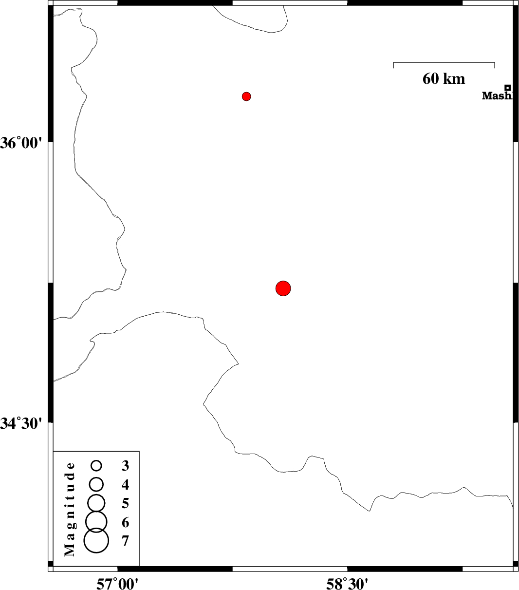 | 2012/07/20 | 00:16:51.4 | 04:46:51.4 | 35.22 | 58.08 | 26 | ML4.4 | Khorasan(center) Province, 13 km East of Bardeskan | ||