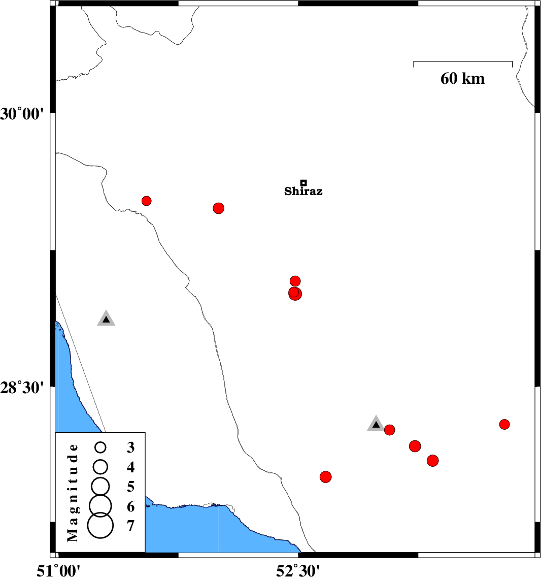 | 2012/07/06 | 00:20:35.4 | 04:50:35.4 | 29.52 | 51.55 | 6 | ML2.7 | Fars Province, 15 km West of Kazerun | ||