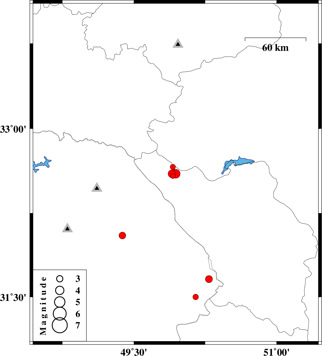 | 2012/07/22 | 10:16:27.4 | 14:46:27.4 | 32.6 | 49.94 | 14 | ML4.2 | Chaharmahal Bakhtiari Province, 22 km North-West of Chelgard | ||