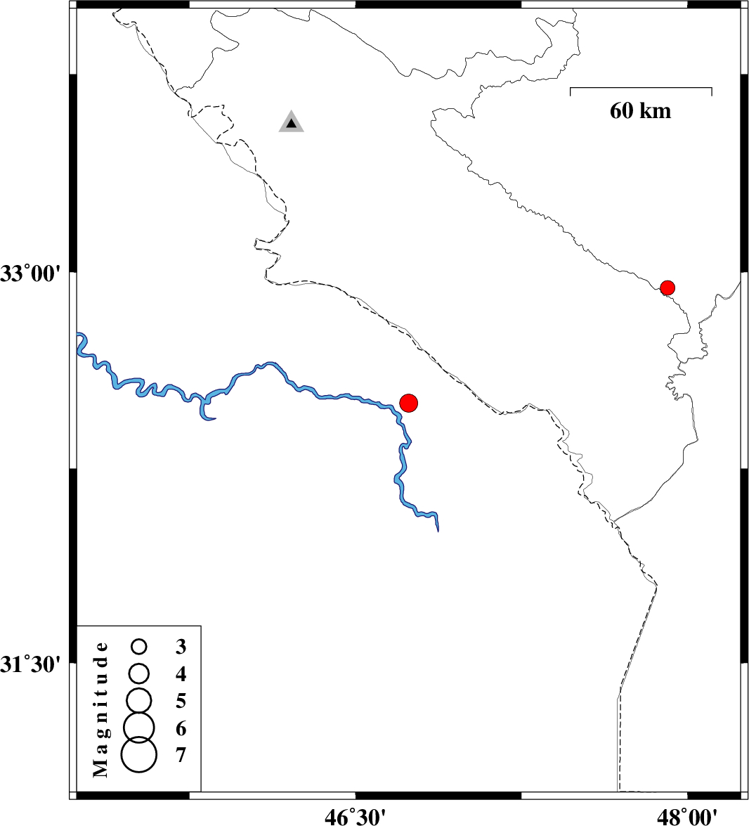 | 2012/07/25 | 13:08:54.5 | 17:38:54.5 | 32.5 | 46.74 | 18 | ML3.7 | Iraq, 53 km South-West of Dehloran | ||
