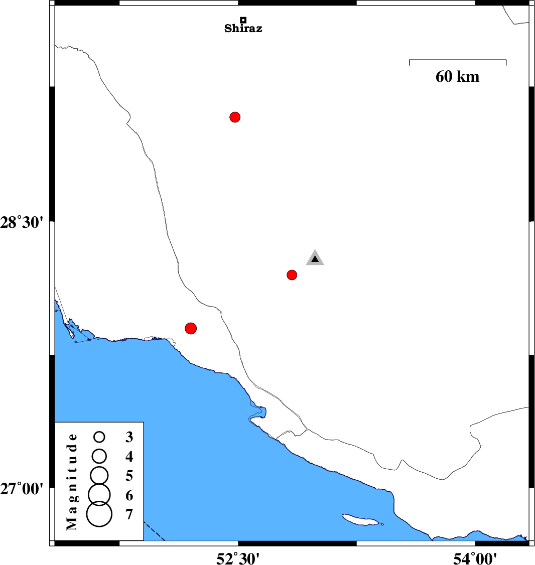 | 2012/07/26 | 04:44:22.7 | 09:14:22.7 | 28.2 | 52.84 | 14 | ML2.8 | Fars Province, 35 km South-West of Qir va Karzin | ||
