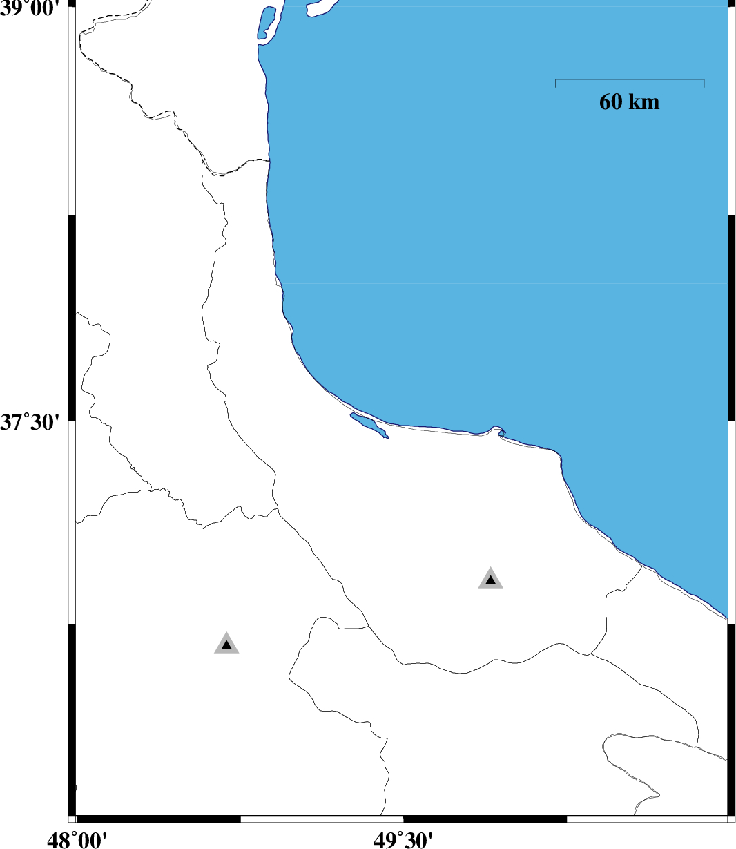 | 2012/07/29 | 03:41:32.9 | 08:11:32.9 | 37.54 | 49.5 | 14 | ML2.9 | Caspian Sea, 8 km Bandar-e anzali | ||