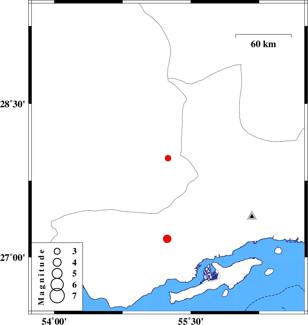 | 2012/07/12 | 21:18:30.0 | 01:48:30.0 | 27.18 | 55.24 | 39 | ML4 | Hormozgan Province, 87 km East of Bastak |