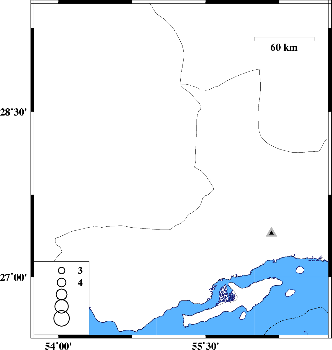 | 2012/07/30 | 17:18:19.8 | 21:48:19.8 | 27.97 | 55.25 | 14 | ML2.9 | Fars Province, 74 km South-West of Hajiabad |