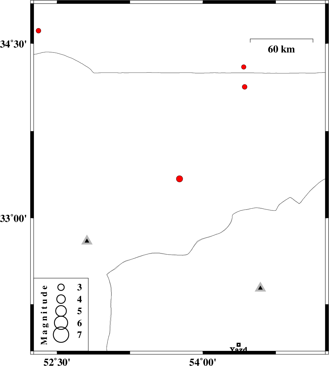 | 2012/07/31 | 18:30:27.1 | 23:00:27.1 | 33.34 | 53.76 | 18 | ML3 | Esfahan Province, 81 km North-East of Nain | ||