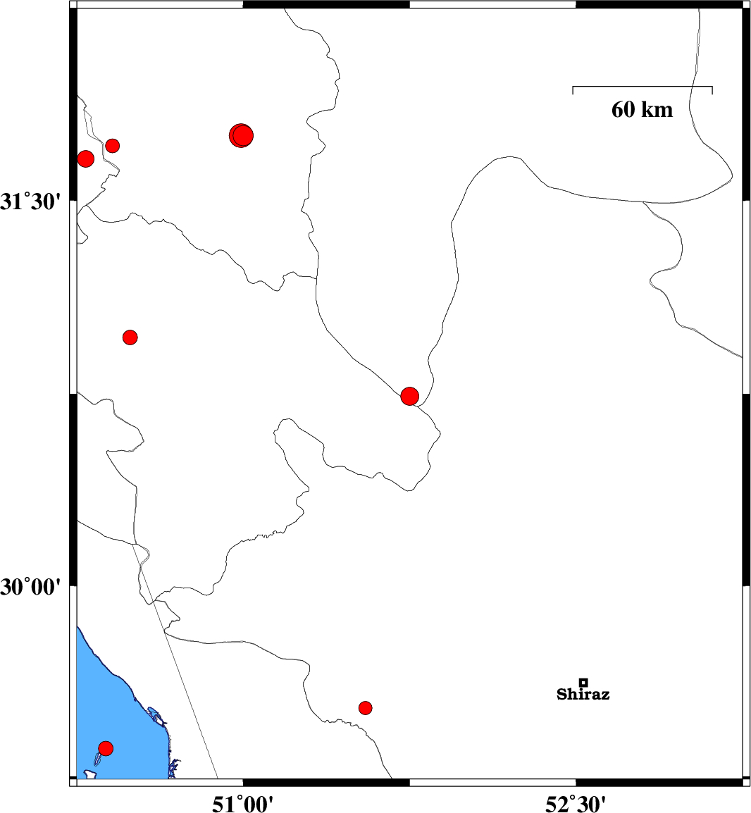 | 2012/07/06 | 00:20:35.4 | 04:50:35.4 | 29.52 | 51.55 | 6 | ML2.7 | Fars Province, 15 km West of Kazerun |