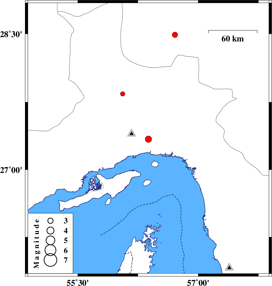 | 2012/08/07 | 18:52:28.6 | 23:22:28.6 | 27.34 | 56.38 | 14 | ML3.7 | Hormozgan Province, 19 km North of Bandar-e abbas | ||