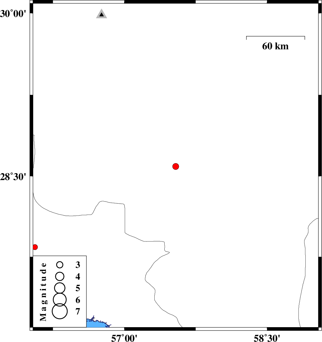 | 2012/08/10 | 06:14:27.8 | 10:44:27.8 | 28.59 | 57.54 | 14 | ML2.9 | Kerman Province, 21 km West of Jiroft | ||