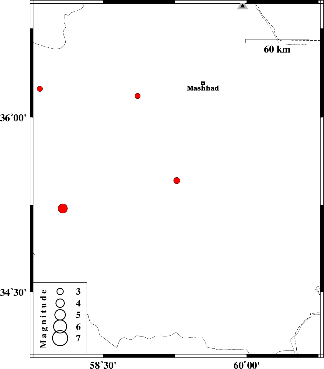 | 2012/07/20 | 00:16:51.4 | 04:46:51.4 | 35.22 | 58.08 | 26 | ML4.4 | Khorasan(center) Province, 13 km East of Bardeskan | ||