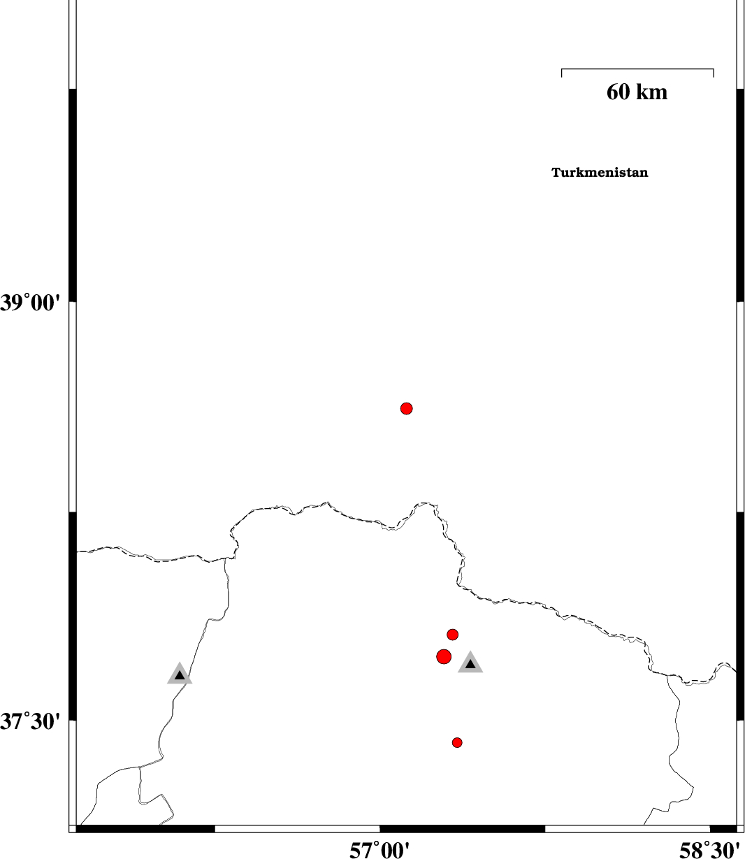 | 2012/08/09 | 01:11:54.5 | 05:41:54.5 | 37.73 | 57.29 | 14 | ML2.9 | Khorasan(north) Province, 28 km North of Bojnurd |
