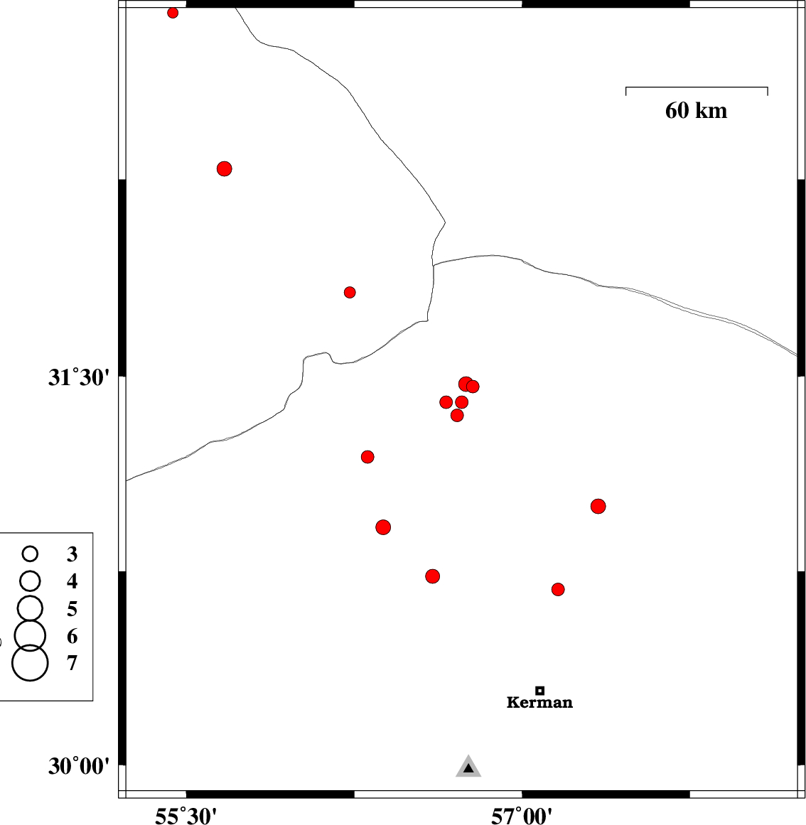 | 2012/07/18 | 06:54:05.6 | 11:24:05.6 | 31 | 57.34 | 14 | ML3 | Kerman Province, 58 km South-East of Ravar |