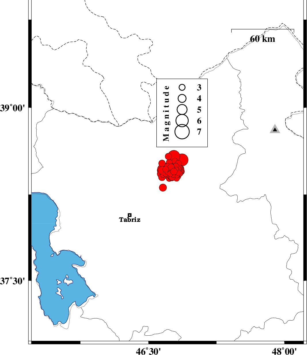 | 2012/08/11 | 12:23:16.2 | 16:53:16.2 | 38.55 | 46.87 | 15 | Mb6.1 | Azarbaijan Sharghi Province, 20 km West of Ahar |