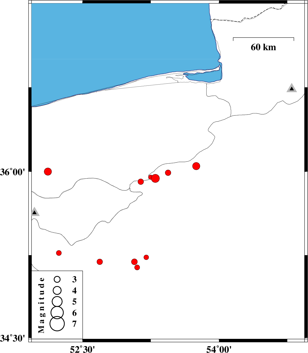 | 2012/08/05 | 19:54:44.5 | 00:24:44.5 | 36.05 | 53.75 | 14 | ML3.6 | Semnan Province, 55 km South-West of Damghan | ||