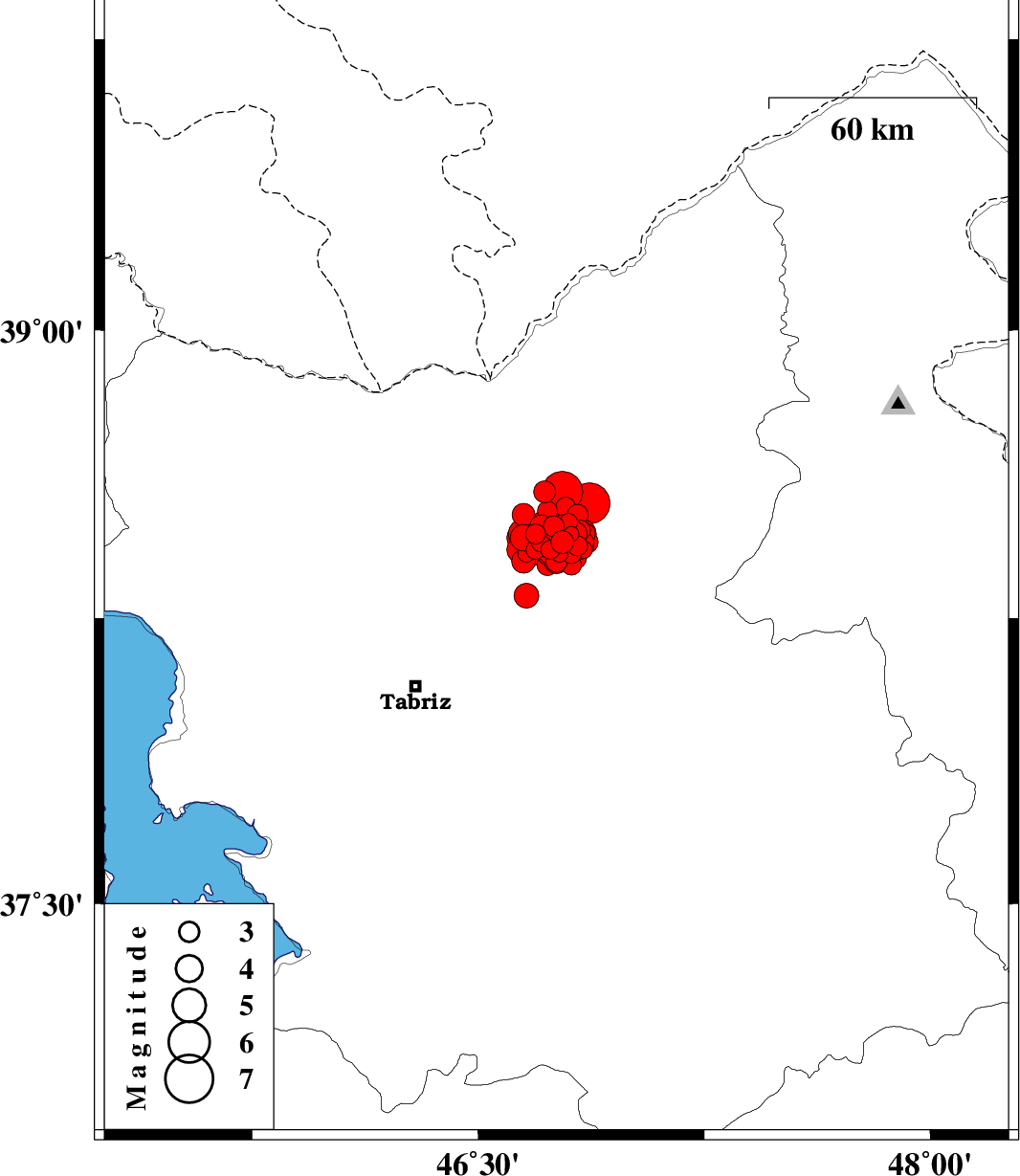 | 2012/08/11 | 12:23:16.2 | 16:53:16.2 | 38.55 | 46.87 | 15 | Mb6.1 | Azarbaijan Sharghi Province, 20 km West of Ahar |