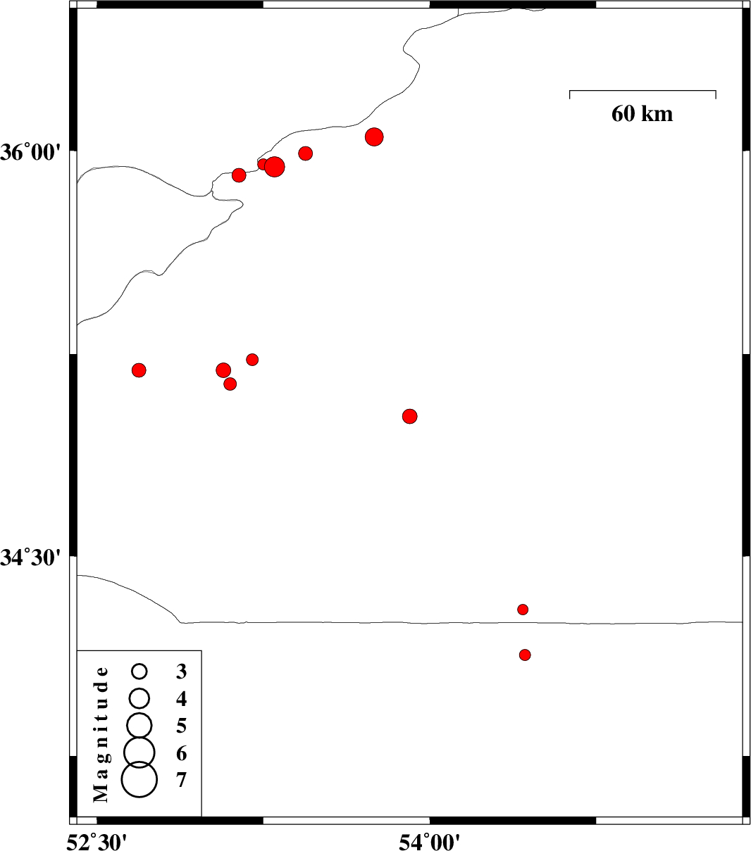 | 2012/08/05 | 19:54:44.5 | 00:24:44.5 | 36.05 | 53.75 | 14 | ML3.6 | Semnan Province, 55 km South-West of Damghan | ||