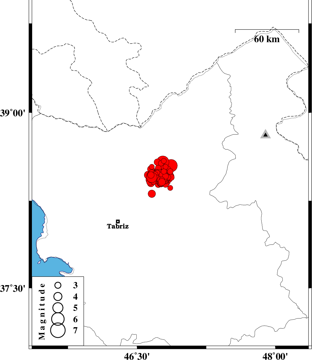 | 2012/08/11 | 12:23:16.2 | 16:53:16.2 | 38.55 | 46.87 | 15 | Mb6.1 | Azarbaijan Sharghi Province, 20 km West of Ahar |