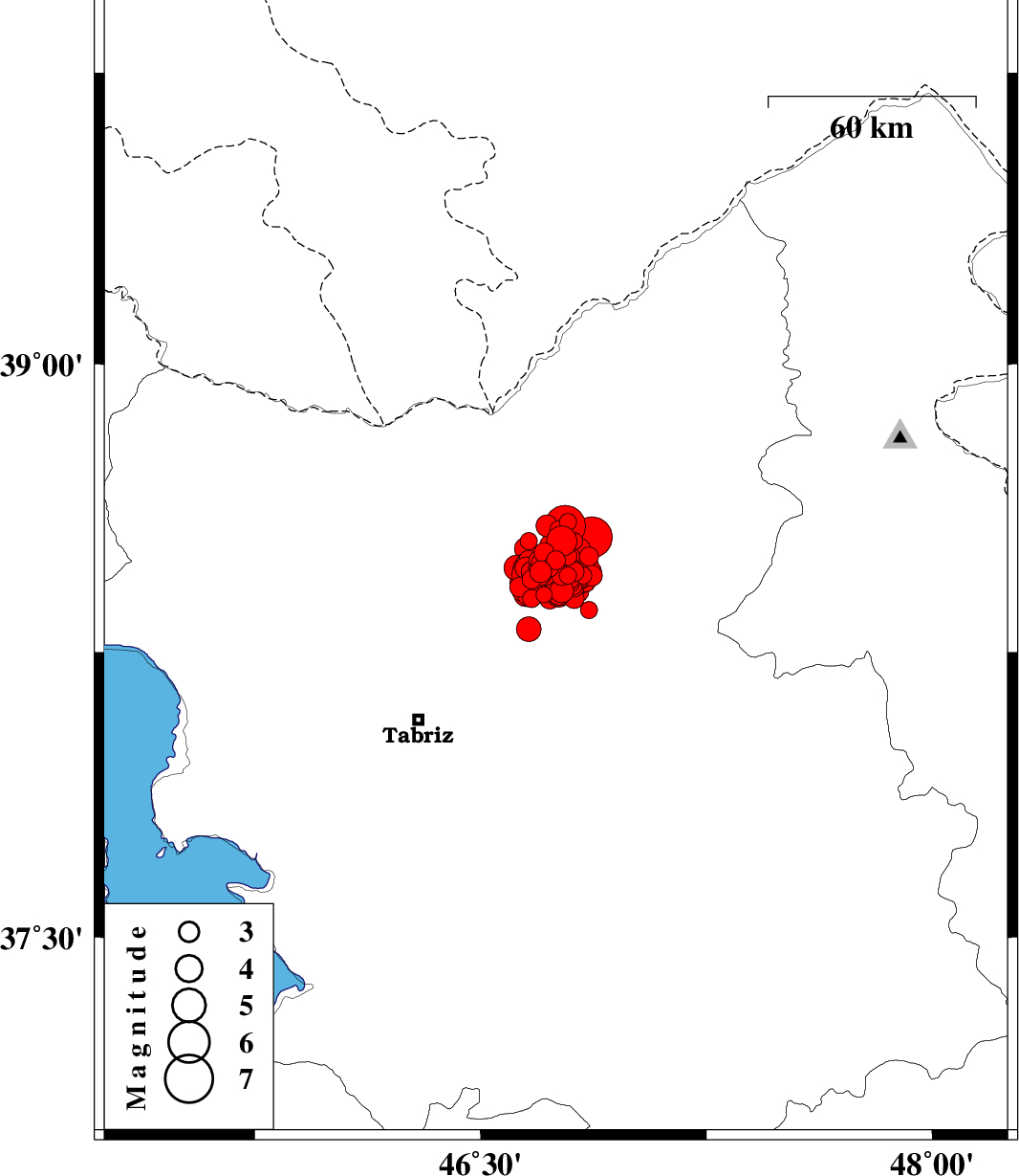 | 2012/08/11 | 12:23:16.2 | 16:53:16.2 | 38.55 | 46.87 | 15 | Mb6.1 | Azarbaijan Sharghi Province, 20 km West of Ahar |