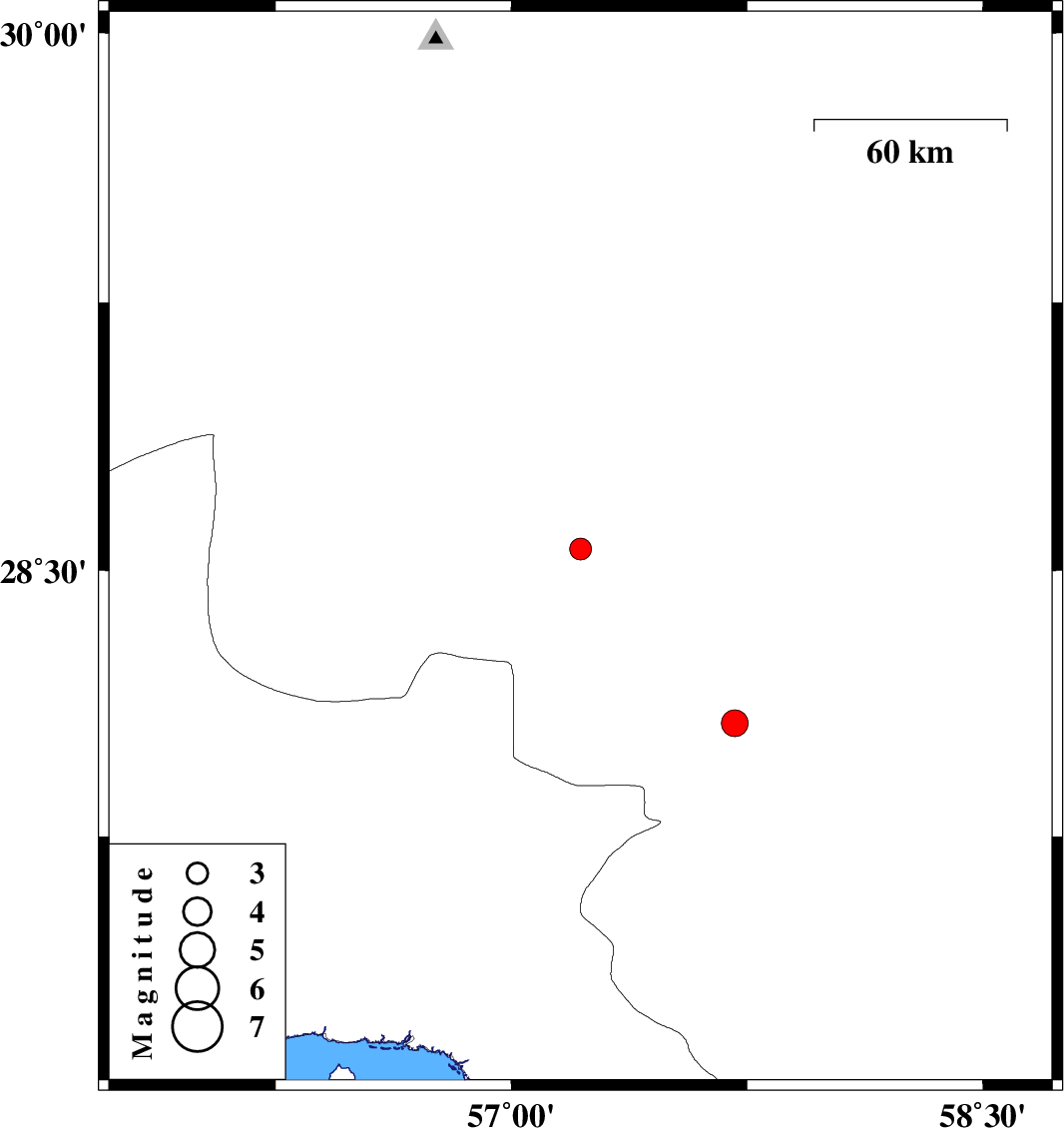 | 2012/08/11 | 11:14:21.7 | 15:44:21.7 | 28.07 | 57.71 | 30 | ML3.8 | Kerman Province, 14 km North of Kahnuj | ||