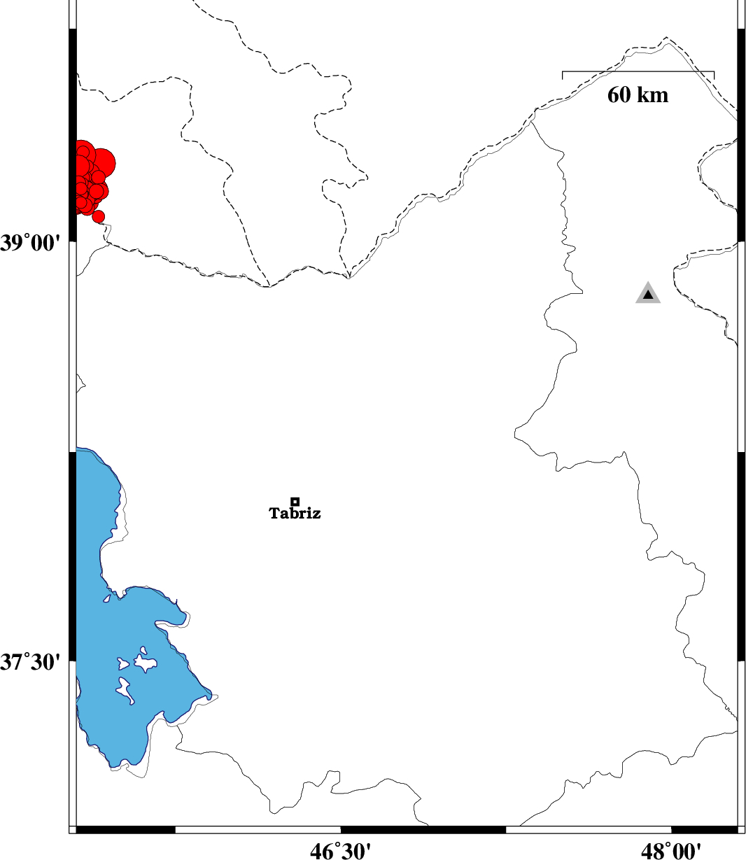 | 2012/08/11 | 12:23:16.2 | 16:53:16.2 | 38.55 | 46.87 | 15 | Mb6.1 | Azarbaijan Sharghi Province, 20 km West of Ahar |
