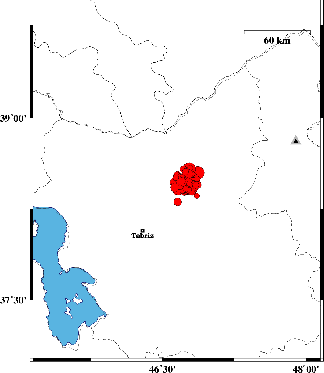 | 2012/08/11 | 12:23:16.2 | 16:53:16.2 | 38.55 | 46.87 | 15 | Mb6.1 | Azarbaijan Sharghi Province, 20 km West of Ahar |