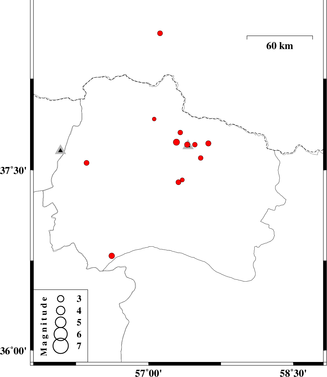 | 2012/07/26 | 07:13:44.7 | 11:43:44.7 | 37.72 | 57.62 | 29 | ML2.6 | Khorasan(north) Province, 37 km North-East of Bojnurd | ||