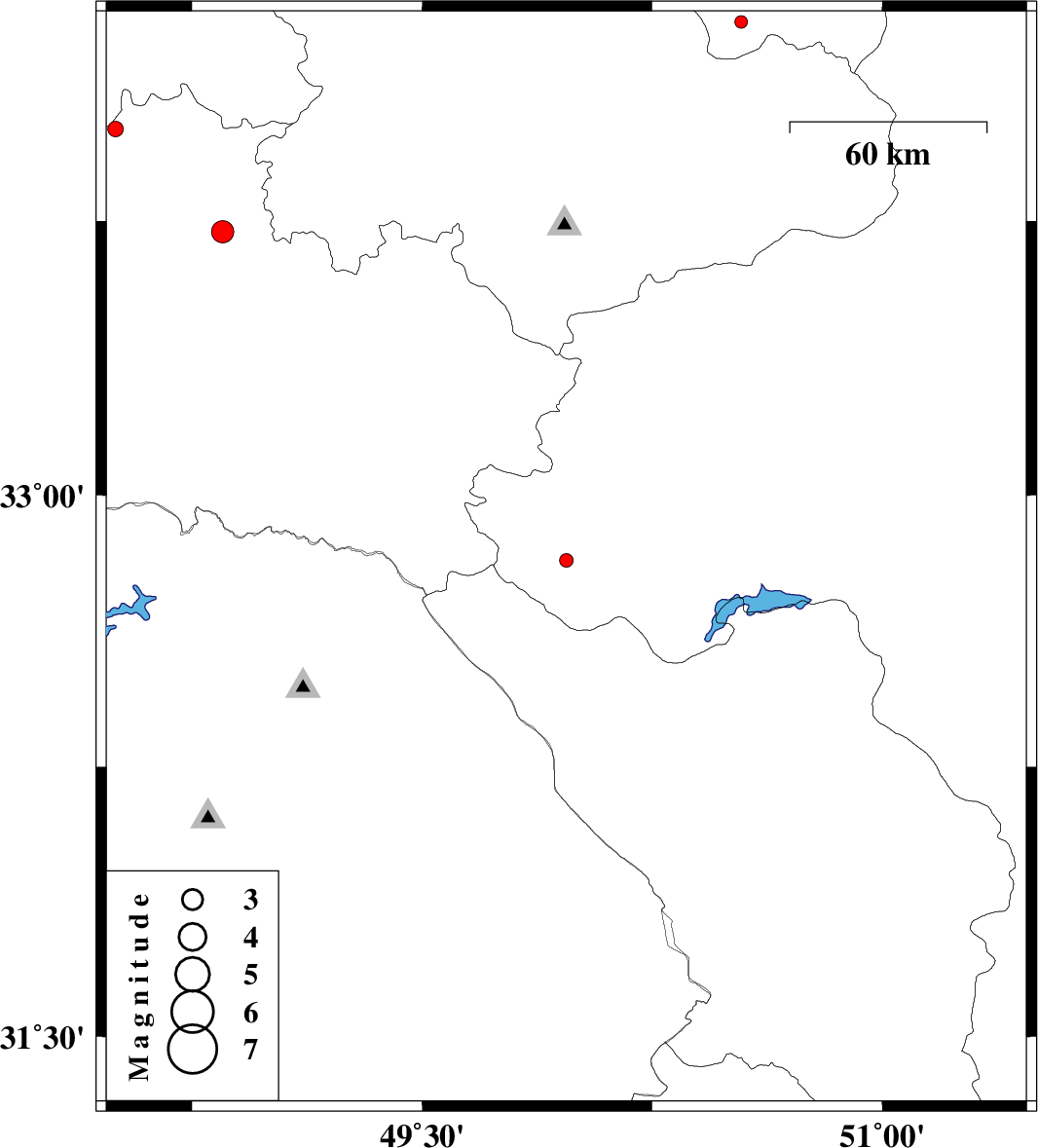 | 2012/08/22 | 06:44:01.7 | 11:14:01.7 | 32.82 | 49.97 | 14 | ML2 | Esfahan Province, 19 km South-West of Fereydunshahr | ||