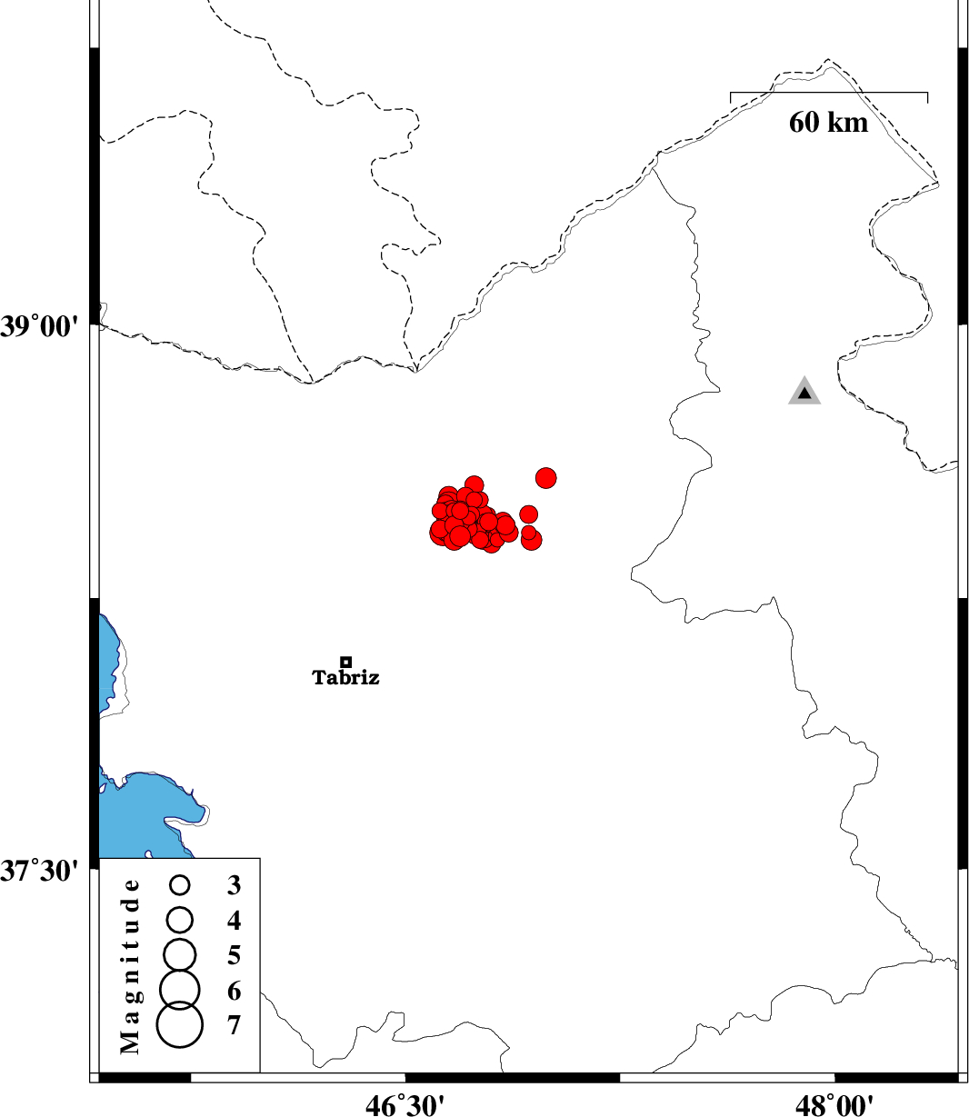 | 2012/08/18 | 01:48:27.0 | 06:18:27.0 | 38.56 | 46.74 | 30 | ML3 | Azarbaijan Sharghi Province, 31 km West of Ahar |