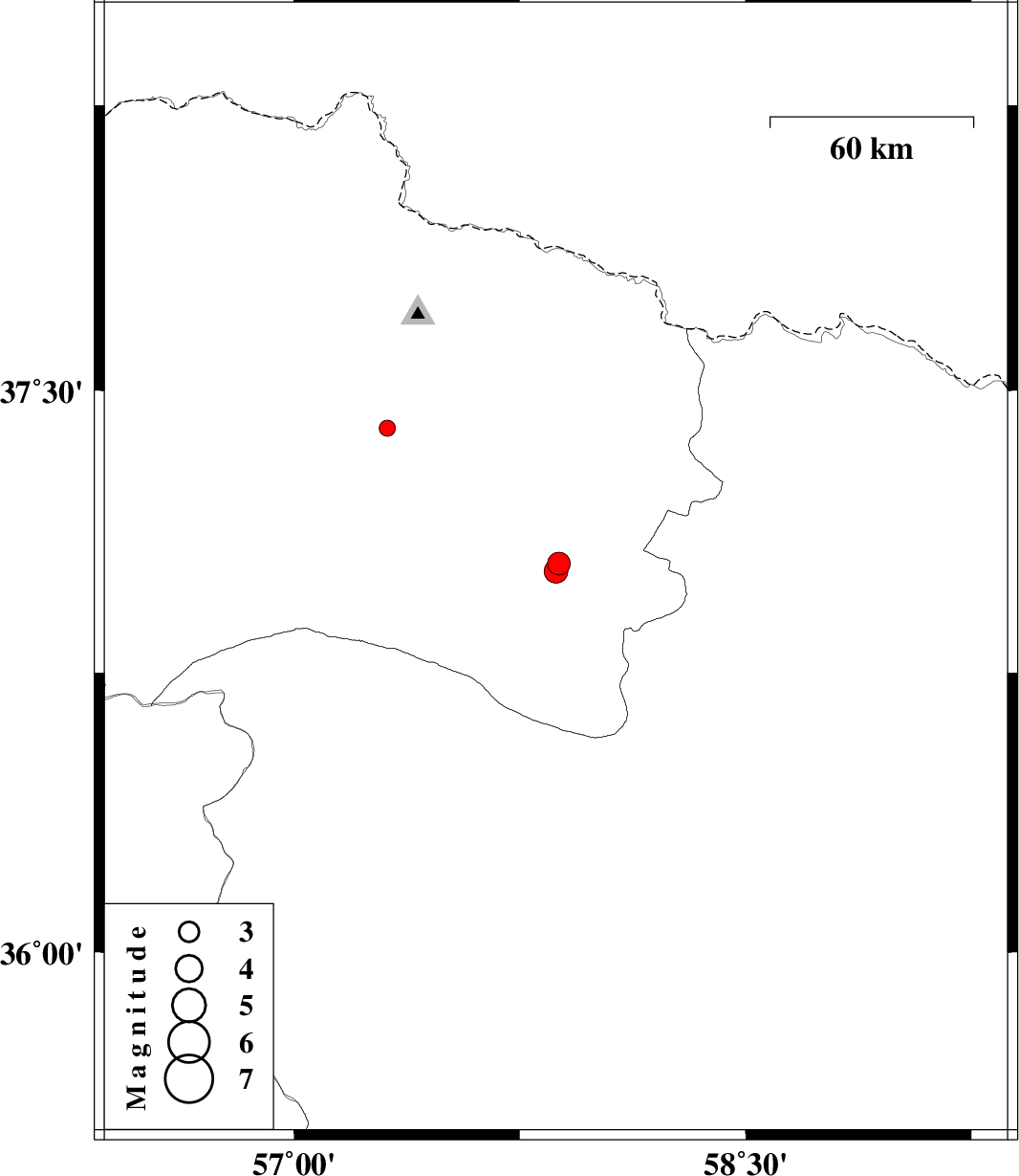 | 2012/08/25 | 06:32:17.9 | 11:02:17.9 | 37.02 | 57.87 | 6 | ML3.5 | Khorasan(north) Province, 33 km East of Esfarayen | ||