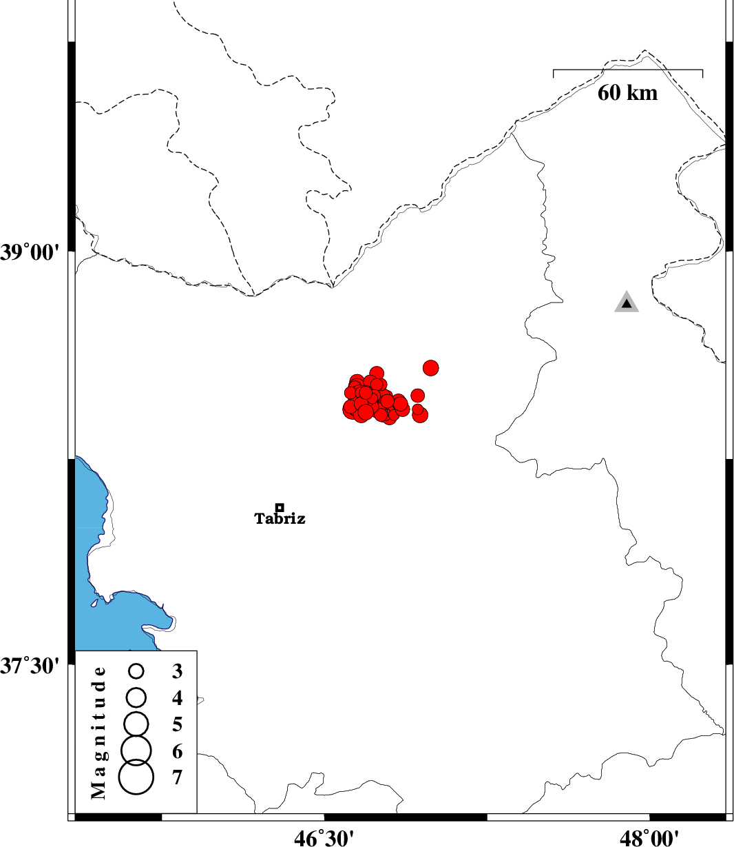 | 2012/08/18 | 01:48:27.0 | 06:18:27.0 | 38.56 | 46.74 | 30 | ML3 | Azarbaijan Sharghi Province, 31 km West of Ahar |