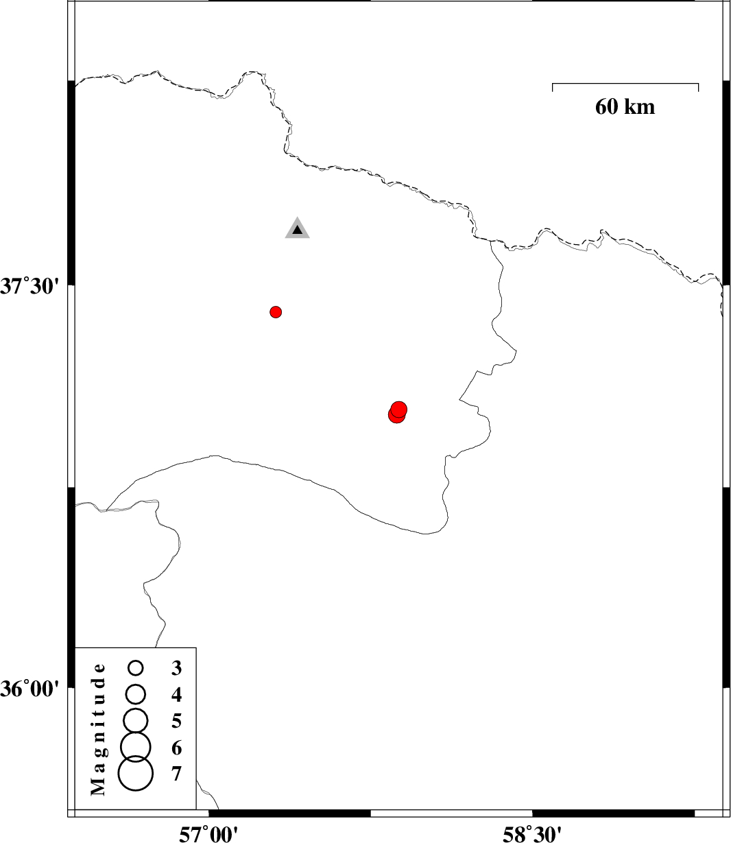 | 2012/08/25 | 06:32:17.9 | 11:02:17.9 | 37.02 | 57.87 | 6 | ML3.5 | Khorasan(north) Province, 33 km East of Esfarayen | ||