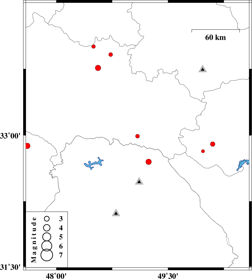 | 2012/08/22 | 06:44:01.7 | 11:14:01.7 | 32.82 | 49.97 | 14 | ML2 | Esfahan Province, 19 km South-West of Fereydunshahr |