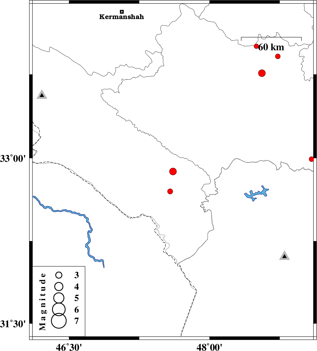| 2012/08/28 | 06:24:19.0 | 10:54:19.0 | 32.88 | 47.61 | 14 | ML3.4 | Ilam Province, 15 km East of Abdanan | ||